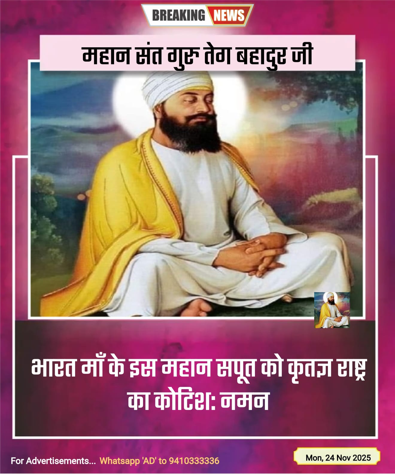 24 नवंबर 2025 को उनका 350 वां बलिदान दिवस है। भारत मां के इस महान सपूत को कृतज्ञ राष्ट्र का कोटिश: नमन। इसी भावना के साथ कि हम सब नैतिक मूल्यों को अपना कर शौर्य,वीरता के साथ-साथ देश, धर्म, मानव व मानव मूल्यों की प्रगति हेतु एकजुट होकर आगे बढ़ेंगे।