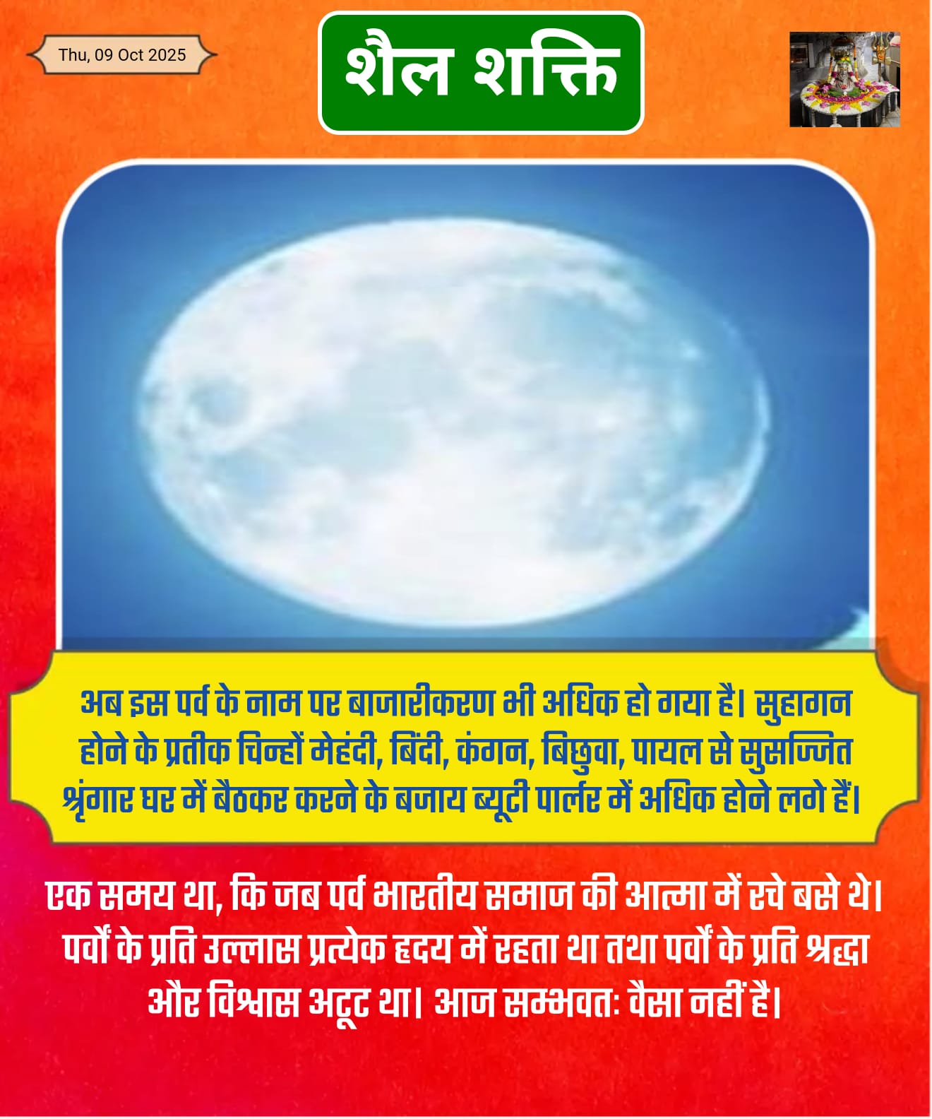 एक समय था, कि जब पर्व भारतीय समाज की आत्मा में रचे बसे थे। पर्वों के प्रति उल्लास प्रत्येक हृदय में रहता था तथा पर्वों के प्रति श्रद्धा और विश्वास अटूट था। आज सम्भवतः वैसा नहीं है। यह समाज में व्याप्त भौतिकता का प्रभाव है, कि पर्व श्रद्धा से कम दिखावे के लिए अधिक मनाए जाने लगे हैं। पति पत्नी के दाम्पत्य जीवन के दीर्घजीवी होने की कामना के पर्व करवा चौथ को ही लें, यह पर्व महिलाएं अपने पति के स्वस्थ दीर्घजीवी होने के करती हैं, यह पर्व पति के प्रति समर्पित पतिव्रता नारी के त्याग व प्रेम का बोध कराता रहा है। वर्तमान में जब पति और पत्नी के दाम्पत्य जीवन में ही संदेह के बादल मंडराने लगे हैं तथा नौकरीपेशा पति पत्नी का दाम्पत्य जीवन समझौते पर टिका है। रिश्ते में सामंजस्य के अभाव के चलते प्रीत भरे रिश्ते में कटुता और हिंसा के समाचार प्रकाश में आ रहे हैं, जिनका अंजाम हत्या जैसे जघन्य अपराध की सीमा तक जा चुका है। दाम्पत्य जीवन में विश्वास की डोर कच्ची होने के चलते परिवार न्यायालयों में तलाक के मुकदमों की संख्या दिनोंदिन बढ़ती जा रही है, तब करवा चौथ जैसे पर्व की प्रासंगिकता पर प्रश्न चिन्ह लगता ही है।