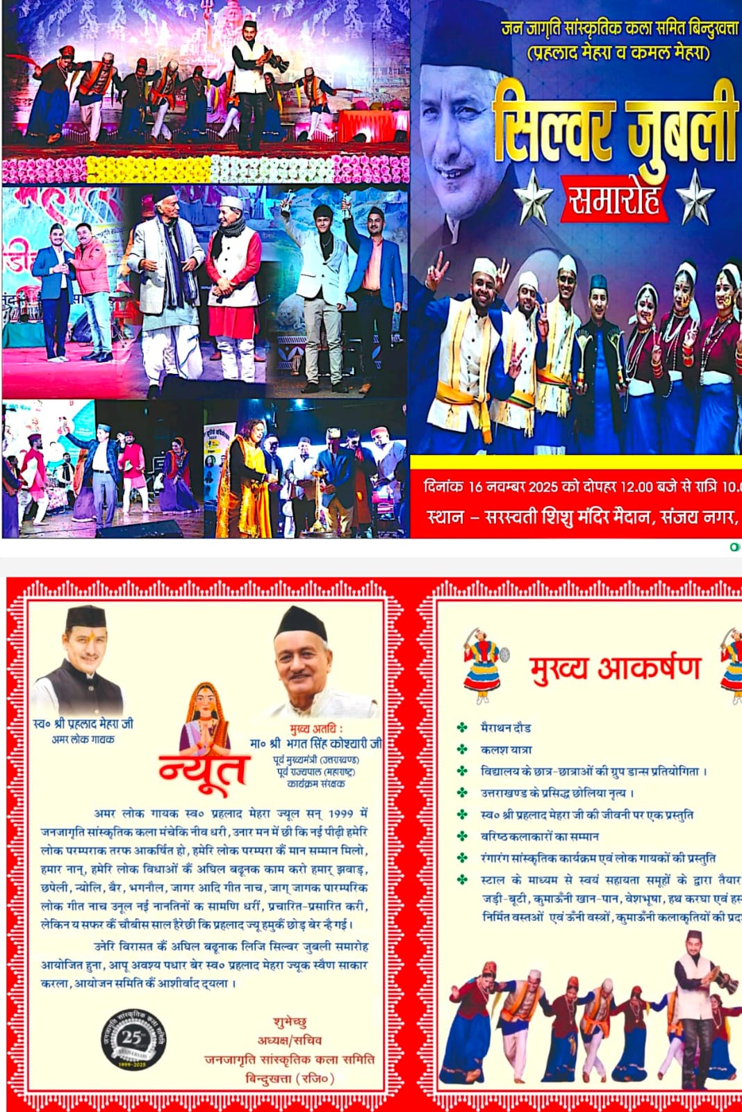 बिन्दुखत्ता। अमर लोकगायक स्वर्गीय श्री प्रहलाद सिंह मेहरा की मधुर स्मृति में सिल्वर जुबली समारोह का भव्य आयोजन आगामी 16 नवम्बर को सरस्वती शिशु मंदिर बिन्दुखत्ता में किया जा रहा है। यह आयोजन जन जागृति सांस्कृतिक कला समिति के तत्वाधान में संपन्न होगा।