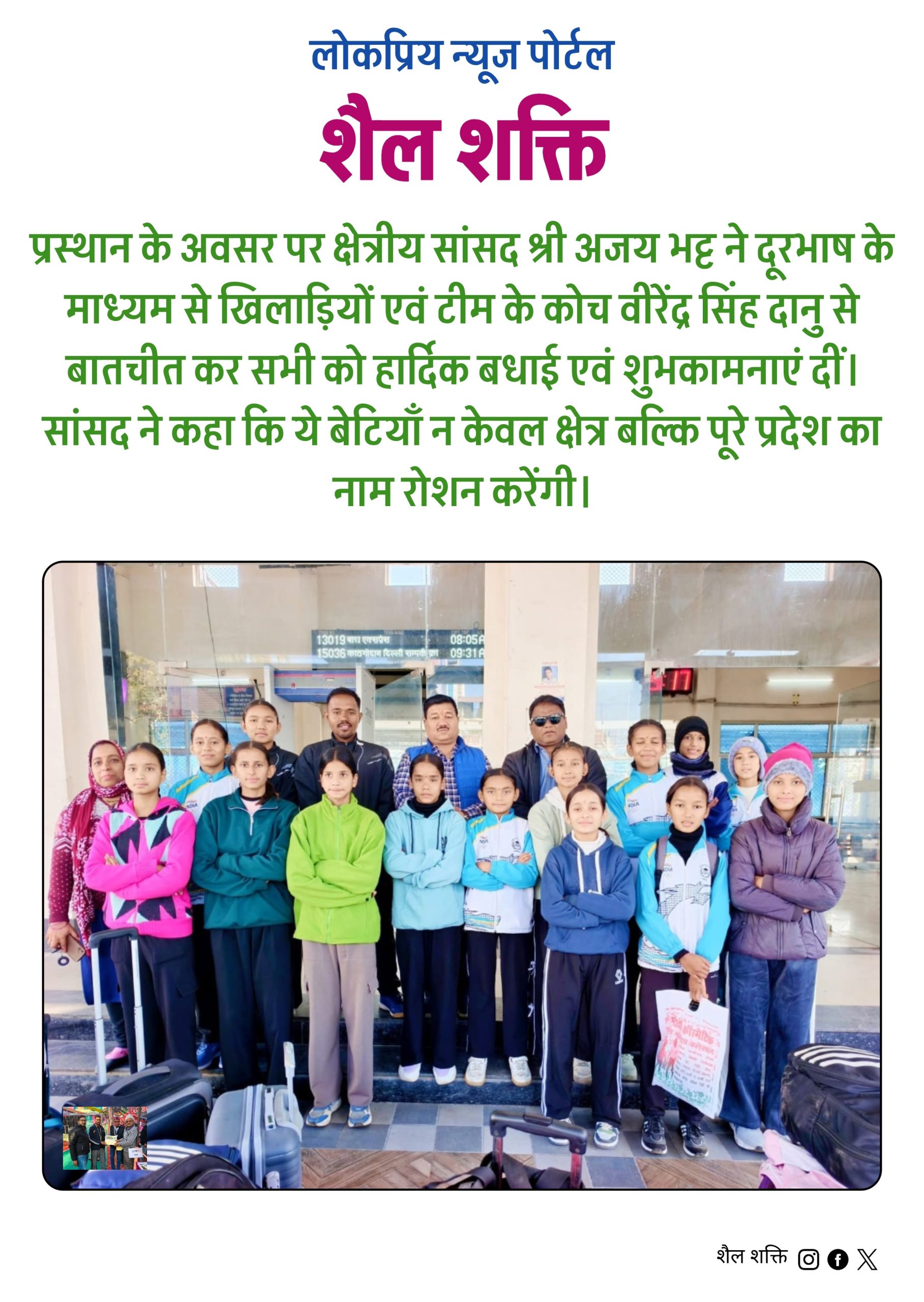 प्रस्थान के अवसर पर क्षेत्रीय सांसद श्री अजय भट्ट ने दूरभाष के माध्यम से खिलाड़ियों एवं टीम के कोच वीरेंद्र सिंह दानु से बातचीत कर सभी को हार्दिक बधाई एवं शुभकामनाएं दीं। सांसद ने कहा कि ये बेटियाँ न केवल क्षेत्र बल्कि पूरे प्रदेश का नाम रोशन करेंगी। उन्होंने खिलाड़ियों का मनोबल बढ़ाते हुए पूरे आत्मविश्वास के साथ उत्कृष्ट प्रदर्शन करने का आह्वान किया।