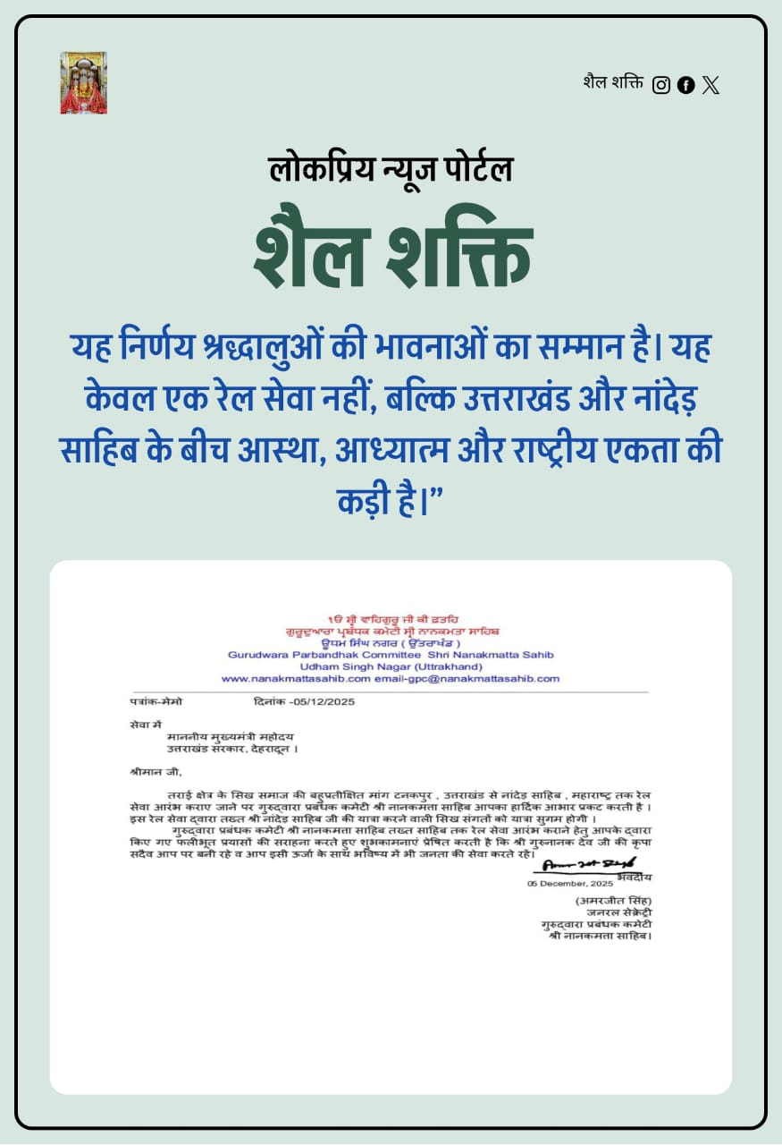 “यह निर्णय श्रद्धालुओं की भावनाओं का सम्मान है। यह केवल एक रेल सेवा नहीं, बल्कि उत्तराखंड और नांदेड़ साहिब के बीच आस्था, आध्यात्म और राष्ट्रीय एकता की कड़ी है।”
