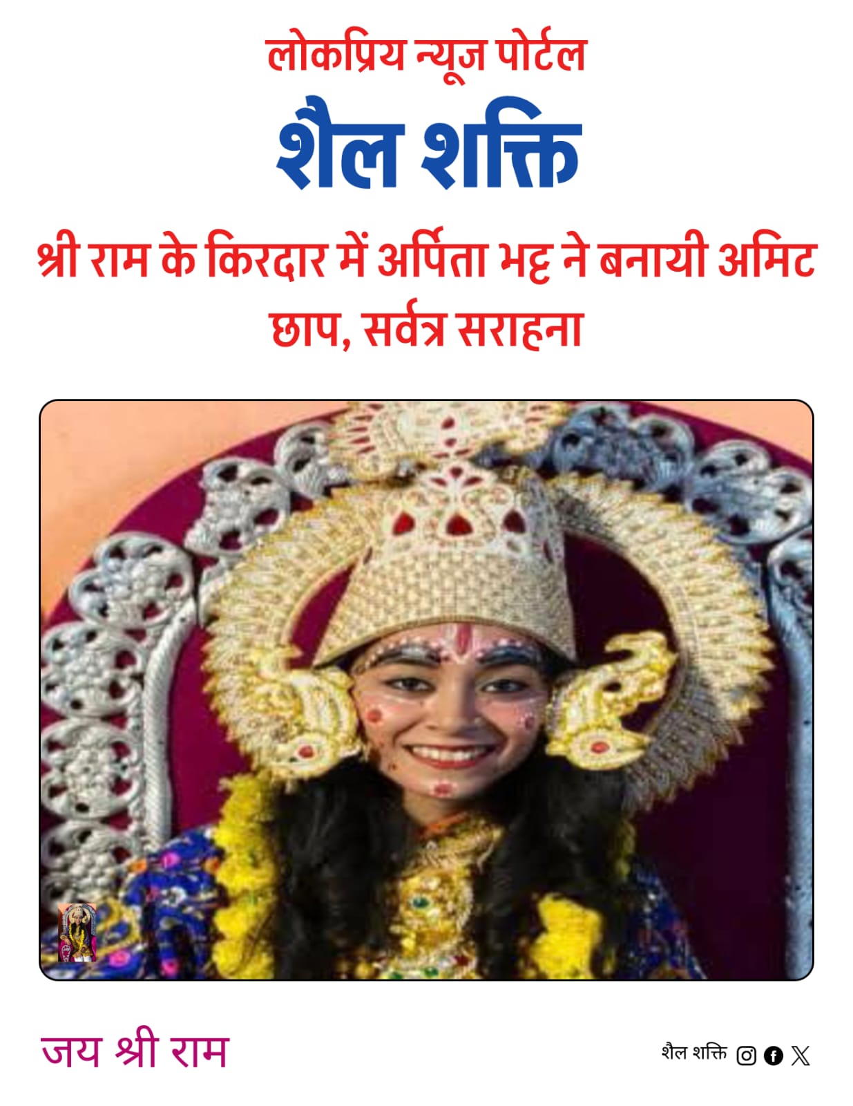 आदर्श रामलीला कमेटी लालकुआं के तत्वावधान में आयोजित श्री राम लीला मंचन में नगर की प्रतिभाशाली छात्रा अर्पिता भट्ट के भगवान राम की भूमिका में किये गए मोहक अभिनय ने दर्शकों को भाव-विभोर कर दिया ।