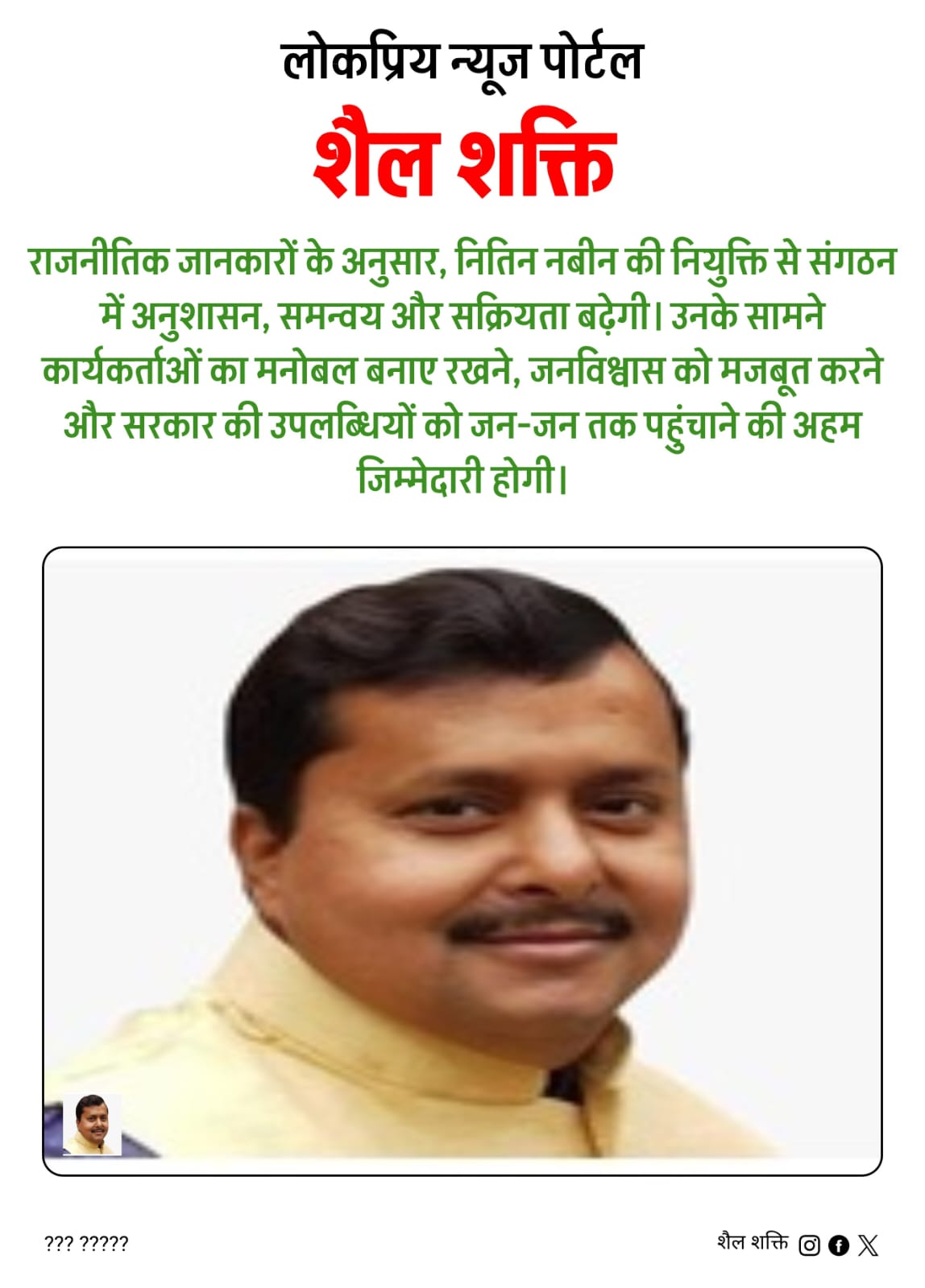 नितिन नबीन को एक अनुभवी, जमीनी और कर्मठ संगठनकर्ता के रूप में जाना जाता है। वे बिहार की राजनीति में लंबे समय से सक्रिय हैं और संगठन व सरकार दोनों स्तरों पर अपनी प्रभावी भूमिका निभा चुके हैं। पार्टी नेतृत्व ने उनके अनुभव, कार्यशैली और संगठनात्मक क्षमता पर भरोसा जताते हुए यह महत्वपूर्ण जिम्मेदारी सौंपी है।