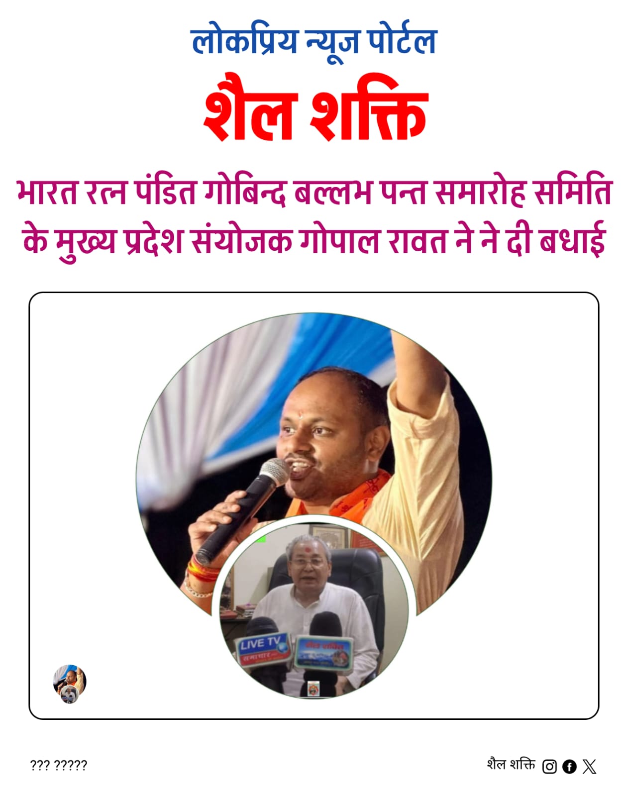 + भारत रत्न पंडित गोबिन्द बल्लभ पन्त समारोह समिति के मुख्य प्रदेश संयोजक गोपाल रावत ने ने दी बधाई एवं शुभकामनाएं, प्रदेश अध्यक्ष का जताया आभार
