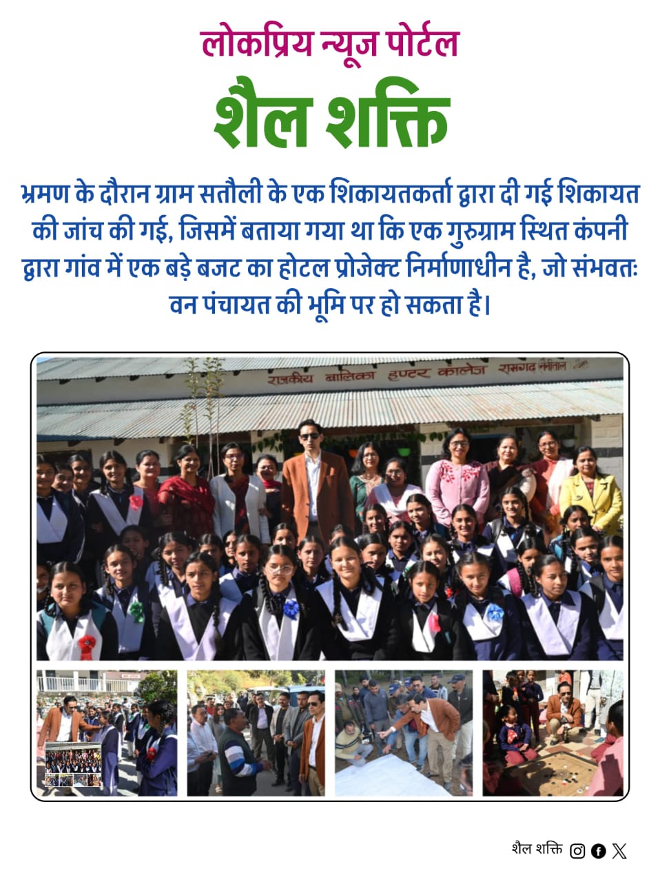 भ्रमण के दौरान ग्राम सतौली के एक शिकायतकर्ता द्वारा दी गई शिकायत की जांच की गई, जिसमें बताया गया था कि एक गुरुग्राम स्थित कंपनी द्वारा गांव में एक बड़े बजट का होटल प्रोजेक्ट निर्माणाधीन है, जो संभवतः वन पंचायत की भूमि पर हो सकता है।
