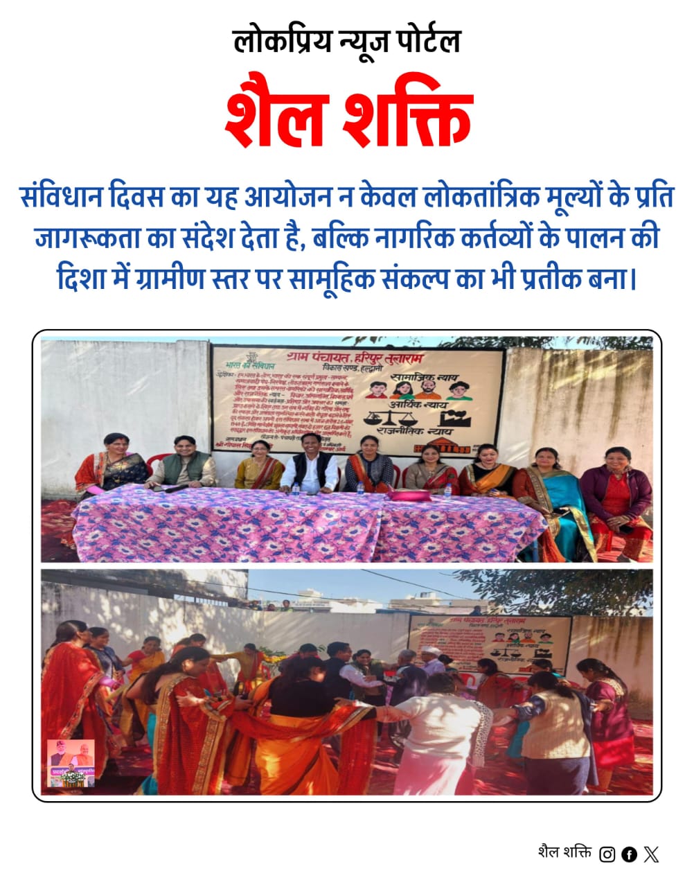 इस अवसर पर ग्राम प्रधान श्री गोपाल सिंह अधिकारी ने उपस्थित जनप्रतिनिधियों, महिलाओं और ग्रामवासियों को संविधान की शपथ दिलाई। उन्होंने भारतीय लोकतंत्र में संविधान की सर्वोच्चता, मौलिक अधिकारों, कर्तव्यों और सामाजिक समानता की भावना पर प्रकाश डालते हुए सभी नागरिकों से उसके पालन की अपील की।
