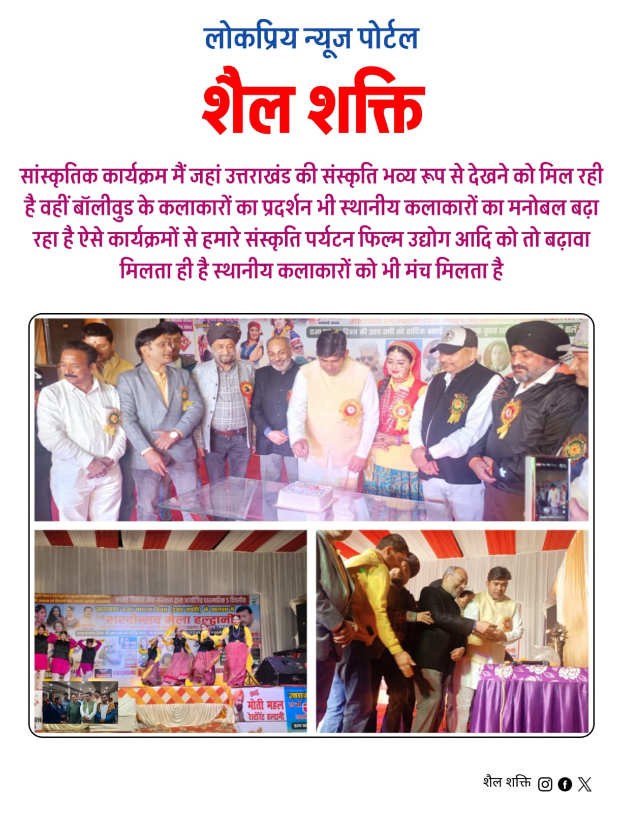 कार्यक्रम का शुभारंभ मुख्य अतिथि राज्य मंत्री, शंकर कोरंगा ,वॉकवेमॉल के प्रबंध निदेशक नीरज शारदा विशिष्ट अतिथि उद्योगपति चरणजीत सिंह शेट्टी, डॉ ललित मोहन रखोलिया संयुक्त निदेशक स्वास्थ्य विभाग, डॉ आशुतोष पंत पूर्व चिकित्सा अधीक्षक ने संयुक्त रूप से दीप प्रज्वलित कर किया डॉ ललित मोहन रखोलिया को राज्य मंत्री द्वारा सोल ओड़ा कर सम्मानित किया गया मुख्य अतिथि श्री कोरंगा ने कहा कि सांस्कृतिक कार्यक्रम मैं जहां उत्तराखंड की संस्कृति भव्य रूप से देखने को मिल रही है वहीं बॉलीवुड के कलाकारों का प्रदर्शन भी स्थानीय कलाकारों का मनोबल बढ़ा रहा है ऐसे कार्यक्रमों से हमारे संस्कृति पर्यटन फिल्म उद्योग आदि को तो बढ़ावा मिलता ही है स्थानीय कलाकारों को भी मंच मिलता है ताकि उनकी प्रतिभाओं का सही तरह से मंचन हो सके मैं इस भव्य आयोजन के लिए मुख्य आयोजक विक्की योगी को और उनकी पूरी टीम को बधाई देता हूं स्वागत समिति की अध्यक्ष दीपिका मेहता ने कहा कि आज उत्तराखंड की मशहूर नृत्यांगना एवं अभिनेत्री साक्षी काला के नृत्य ने शमा बांध दिया नृत्य प्रतियोगिता चौथे दिन भी चला 5:00 बजे बाद फाइनल राउंड हुआ जिसके मुख्य रूप से निर्णायक गुलाबी सरारा गीत से हुए प्रसिद्ध कोरियोग्राफर अंकित कुमार है साथ कोरियोग्राफर नितिन चौहान, डांसर एक्ट्रेस हर्षिता कोहली भी निर्णायक मंडल में रहे नृत्य प्रतियोगिता में एक से एक बढ़कर टैलेंट देखने को मिला प्रसिद्ध कोरियोग्राफर निर्णायक अंकित कुमार ने सभी विजेताओं की घोषणा की