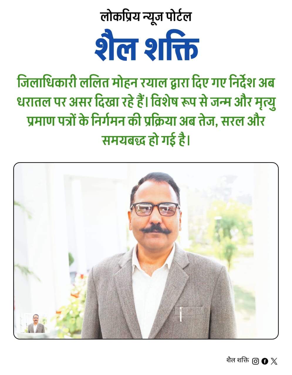 जनसुविधाओं में सुधार और प्रशासनिक कार्यों में पारदर्शिता लाने की दिशा में जिलाधिकारी ललित मोहन रयाल द्वारा दिए गए निर्देश अब धरातल पर असर दिखा रहे हैं। विशेष रूप से जन्म और मृत्यु प्रमाण पत्रों के निर्गमन की प्रक्रिया अब तेज, सरल और समयबद्ध हो गई है।