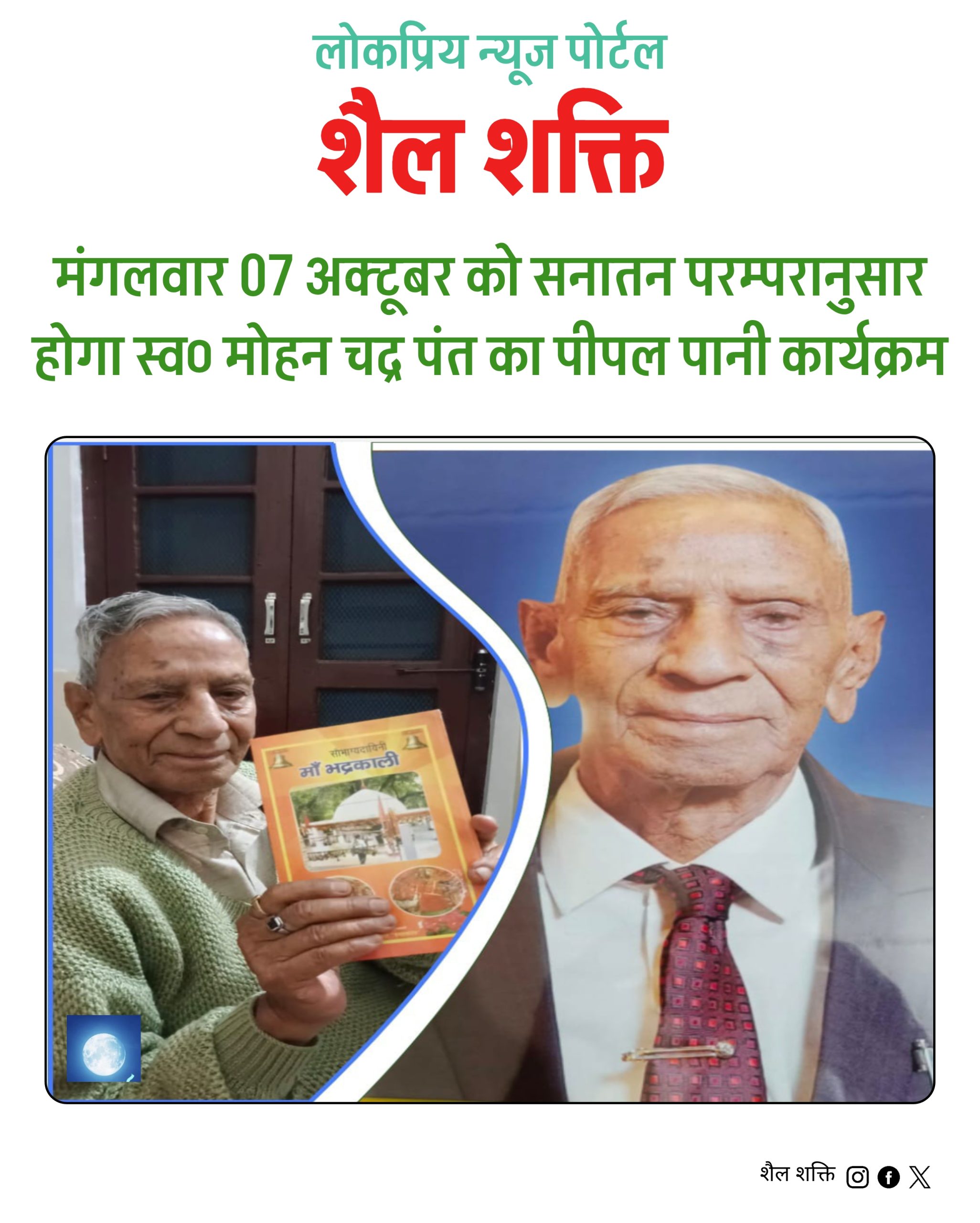 बताते चलें कि पूर्व वन क्षेत्राधिकारी मोहन चन्द्र पन्त 26 सितम्बर 2025 को 91 वर्ष की आयु में अपने भौतिक शरीर का त्याग कर गोलोक धाम को प्रस्थान कर गए थे । सनातन हिन्दू परम्परानुसार 07 अक्टूबर मंगलवार को उनका उनका पीपल पानी का कार्यक्रम सम्पन्न होना है।
