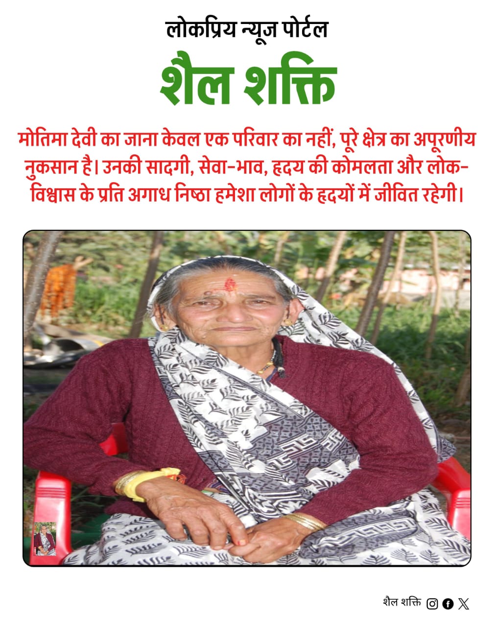 मोतिमा देवी का जाना केवल एक परिवार का नहीं, पूरे क्षेत्र का अपूरणीय नुकसान है। उनकी सादगी, सेवा–भाव, हृदय की कोमलता और लोक–विश्वास के प्रति अगाध निष्ठा हमेशा लोगों के हृदयों में जीवित रहेगी।