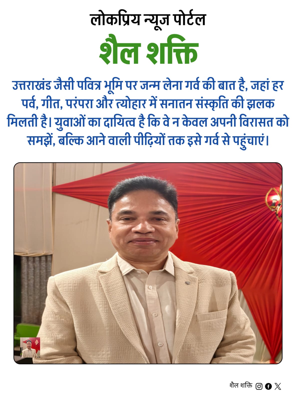 वरिष्ठ समाजसेवी भूपेंद्र सिंह बिष्ट भाई जी ने युवाओं से समाज, संस्कृति और अपने भविष्य के प्रति सजग रहने का आह्वान किया है। एक मुलाकात के दौरान उन्होंने कहा कि आज का युवा वर्ग आधुनिकता की दौड़ में अपनी जड़ों और संस्कारों से दूर होता जा रहा है, जो चिंता का विषय है।