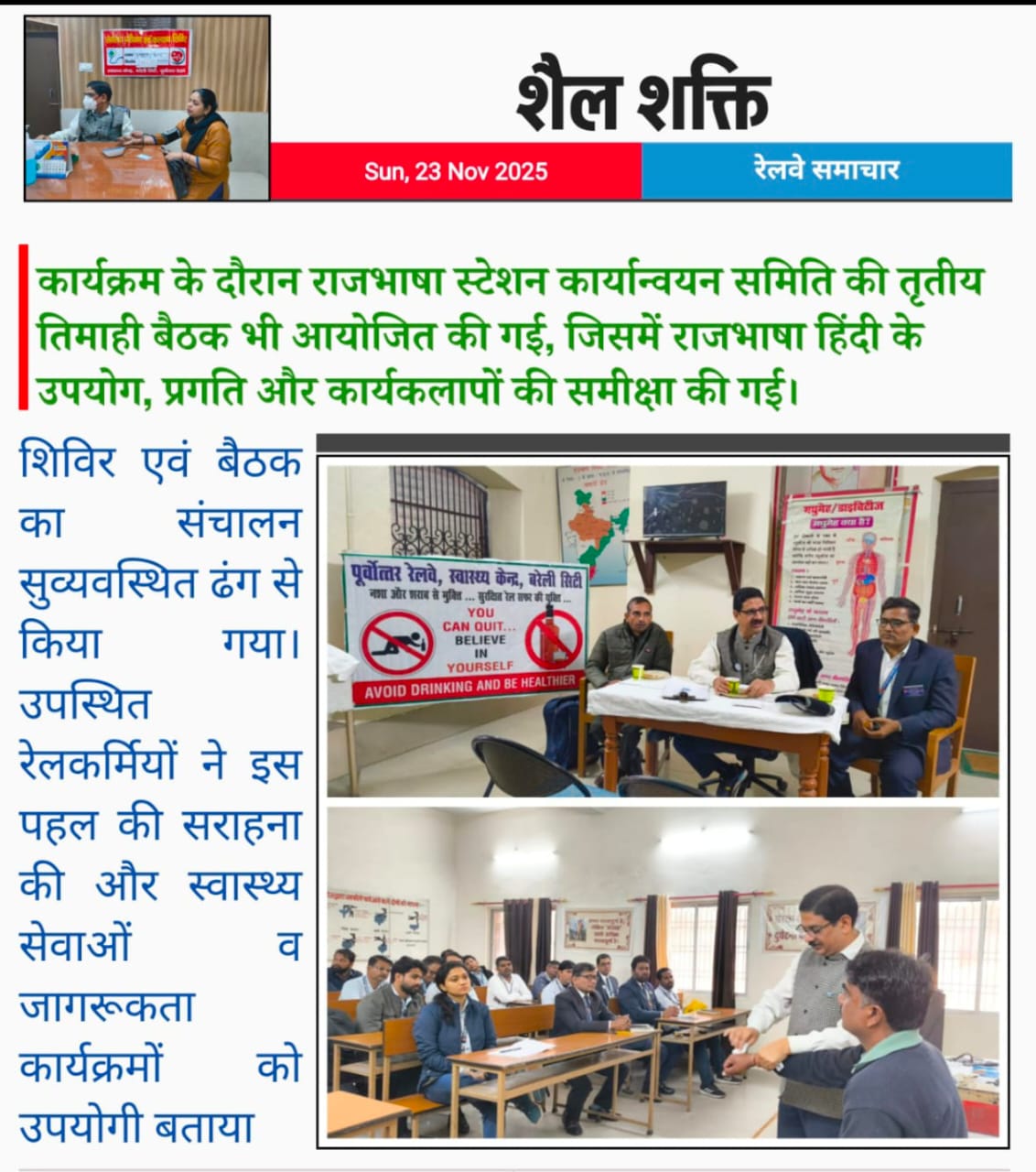 बरेली, 23 नवम्बर 2025। पूर्वोत्तर रेलवे, इज्जतनगर मंडल द्वारा बरेली सिटी स्थित मंडल रेलवे चिकित्सालय के स्वास्थ्य केंद्र में राजभाषा स्टेशन कार्यान्वयन समिति, बरेली सिटी की तृतीय तिमाही बैठक एवं स्वास्थ्य शिविर का सफल आयोजन 22 नवम्बर को किया गया। कार्यक्रम की अध्यक्षता मुख्य चिकित्सा अधीक्षक डॉ. एस.एस. चौहान ने की।