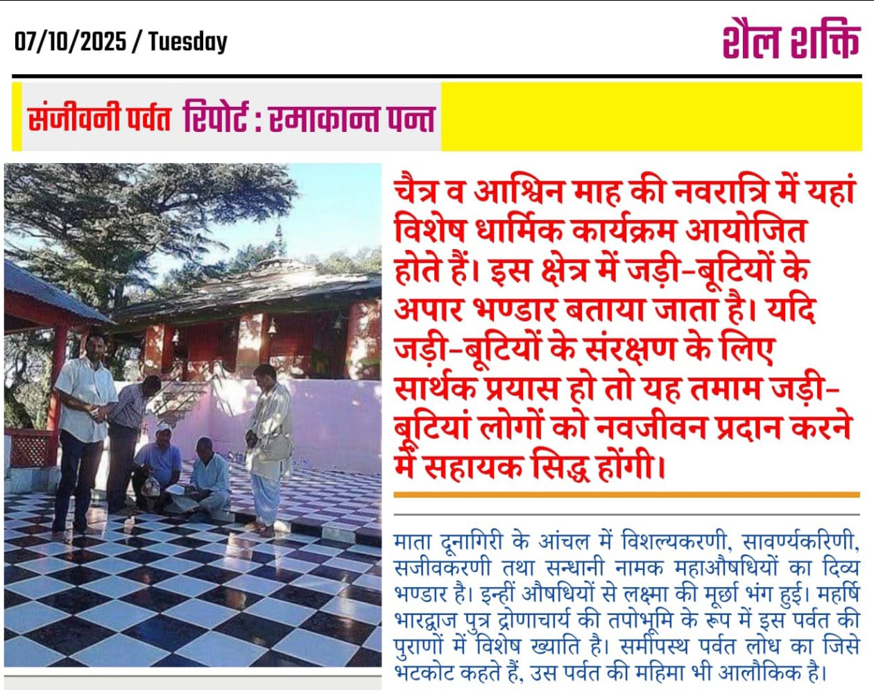 चैत्र व आश्विन माह की नवरात्रि में यहां विशेष धार्मिक कार्यक्रम आयोजित होते हैं। इस क्षेत्र में जड़ी-बूटियों के अपार भण्डार बताया जाता है। यदि जड़ी-बूटियों के संरक्षण के लिए सार्थक प्रयास हो तो यह तमाम जड़ी-बूटियां लोगों को नवजीवन प्रदान करने में सहायक सिद्ध होंगी।