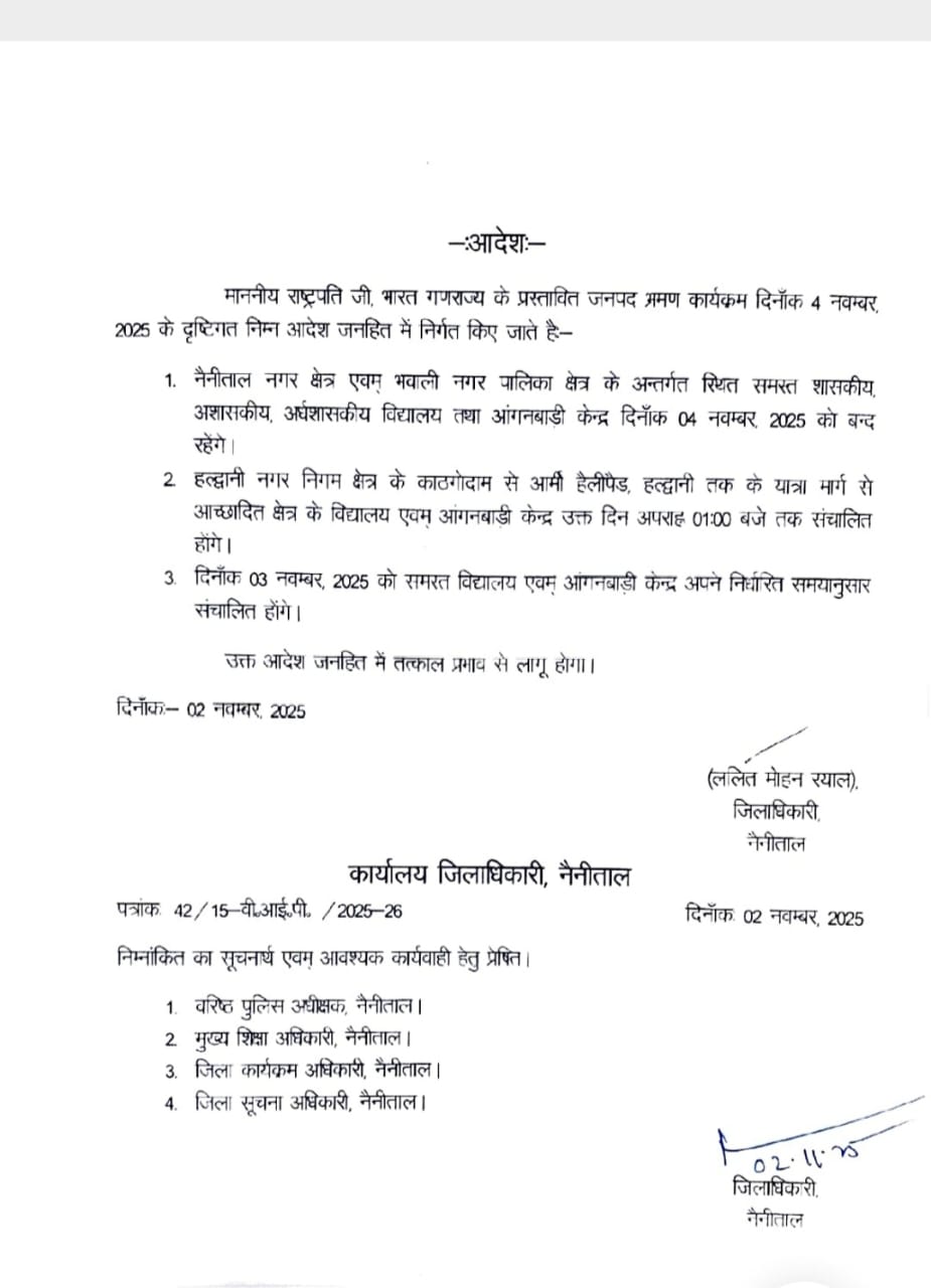 जिलाधिकारी ललित मोहन रयाल ने अवगत कराया कि भारत गणराज्य के माननीय राष्ट्रपति जी के जनपद नैनीताल भ्रमण कार्यक्रम दिनांक 4 नवंबर 2025 के दृष्टिगत नैनीताल नगर क्षेत्र एवं भवाली नगर पालिका क्षेत्र के अंतर्गत स्थित समस्त शासकीय विद्यालय तथा आंगनबाड़ी केंद्र दिनांक 4 नवंबर 2025 को बंद रहेंगे। इसके साथ ही हल्द्वानी नगर निगम क्षेत्र के काठगोदाम से आर्मी हेलीपैड हल्द्वानी तक के यात्रा मार्ग से आच्छादित क्षेत्र के विद्यालय एवं आंगनबाड़ी केंद्र उक्त दिन अपराह्न 1:00 बजे तक संचालित होंगे।