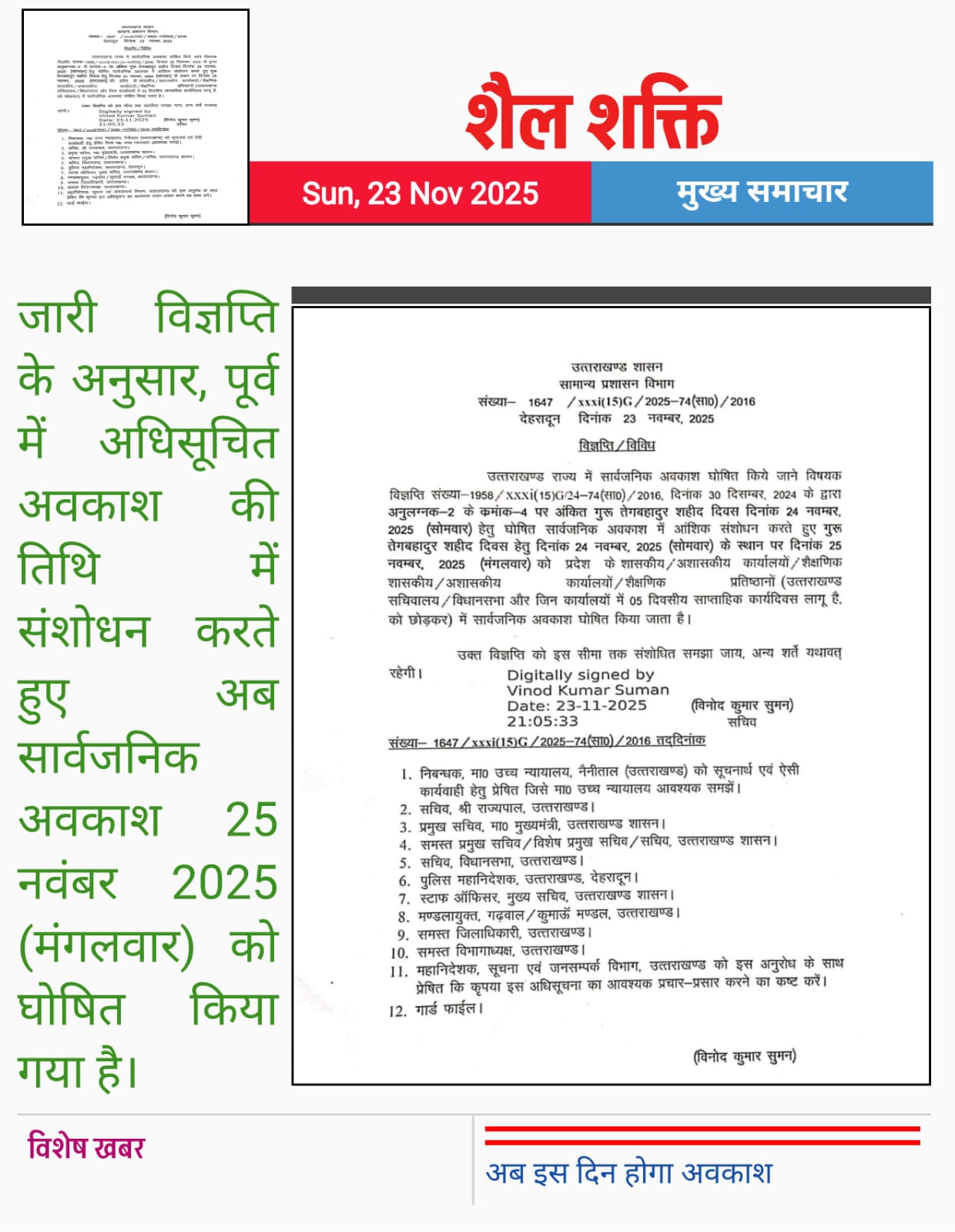 उत्तराखंड शासन, सामान्य प्रशासन विभाग ने आज एक महत्वपूर्ण संशोधन जारी करते हुए 24 नवंबर 2025 (सोमवार) को घोषित गुरु तेगबहादुर शहीद दिवस के सार्वजनिक अवकाश में परिवर्तन कर दिया है।